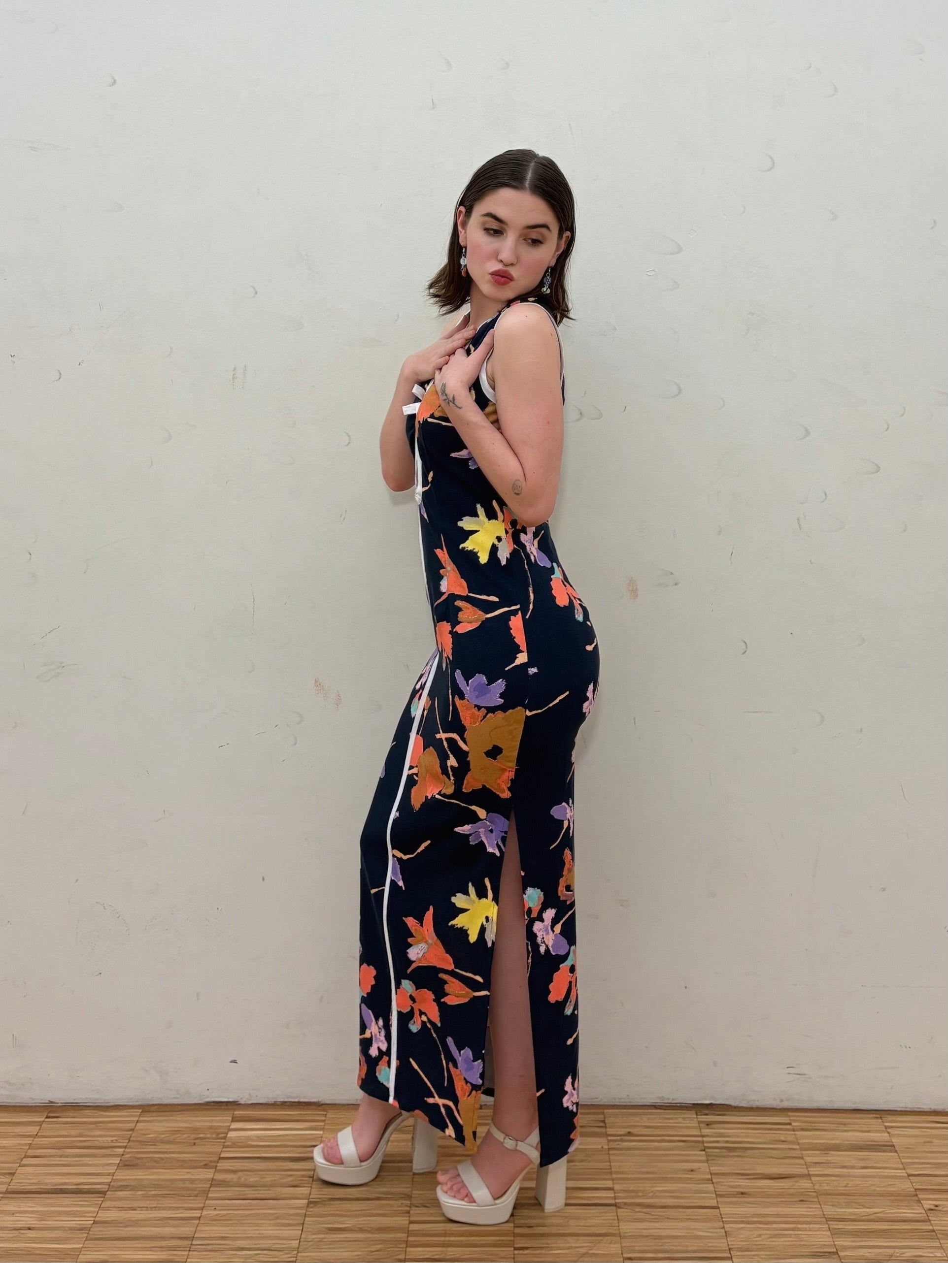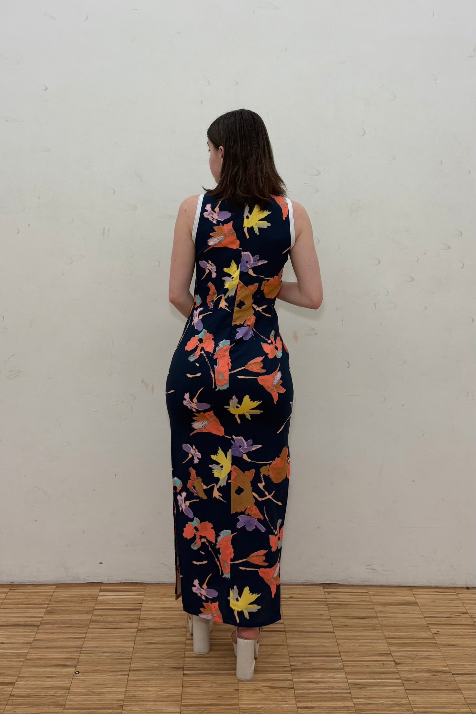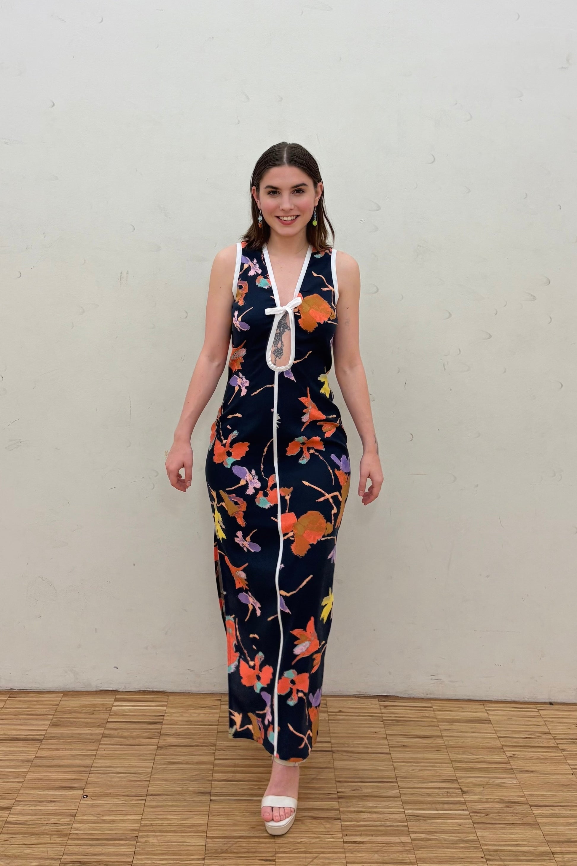Elegant yet playful, the Peek-A-Boo Dress reimagines a signature silhouette with refined contrast detailing and a bold floral print that commands attention. Designed to skim the body without clinging, this floor-length style features a statement keyhole neckline with delicate bow tie, contrast bias trim, and subtle side slits for effortless movement. Megan is 5'5 and wears our size small. You can see our size chat here.